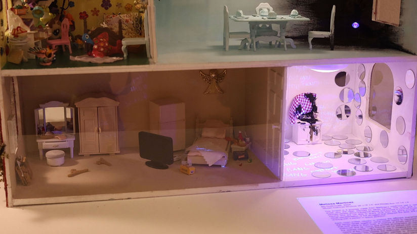 This project is a promise made from Martinez’s childhood self to speak on behalf of those who are often silenced by family trauma. The main goal in this project is to educate people about substance abuse and provide a voice for those affected by similar trauma who are not able to share what they are going through. This dollhouse is a visual representation of the struggles that plagued the artist and their family as a result of living with a person in active addiction.